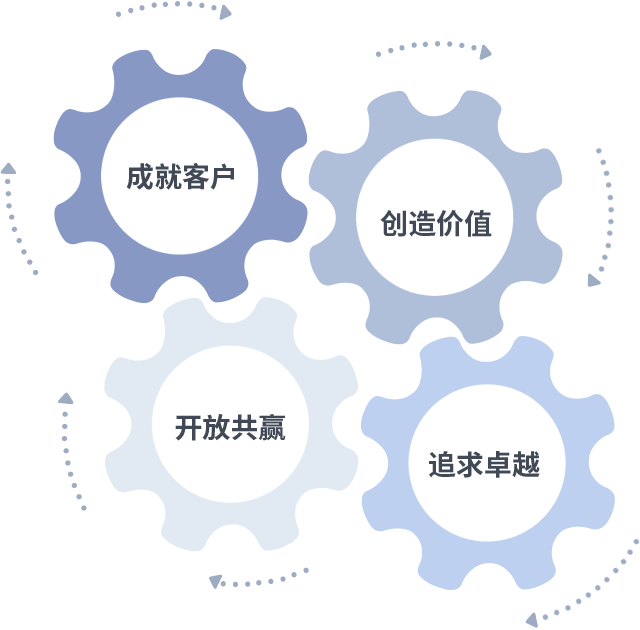 成就客户是一切决策的出发点,创造价值是衡量所有工作的标准,追求卓越是华纳公司做事做人的态度,开放共赢是华纳公司的格局也是最终的结果。价值观的齿轮环环相扣,推动着组织里的每个人不断向前。